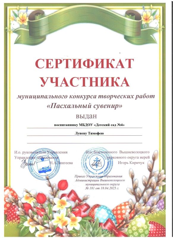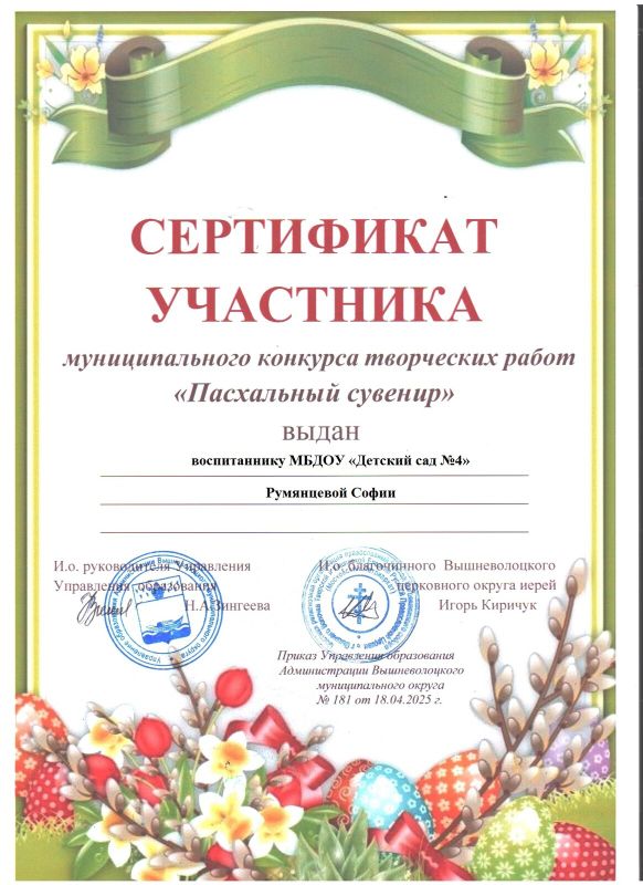 Сертификат участника муниципального конкурса"Пасхальный сувенир"