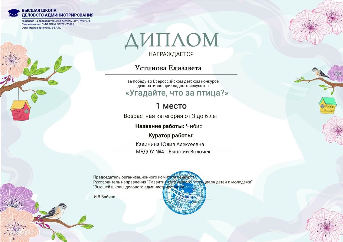 Диплом Устиновой Елизаветы занявшей I место во всероссийском конкурсе "Угадайте, что за птица?"