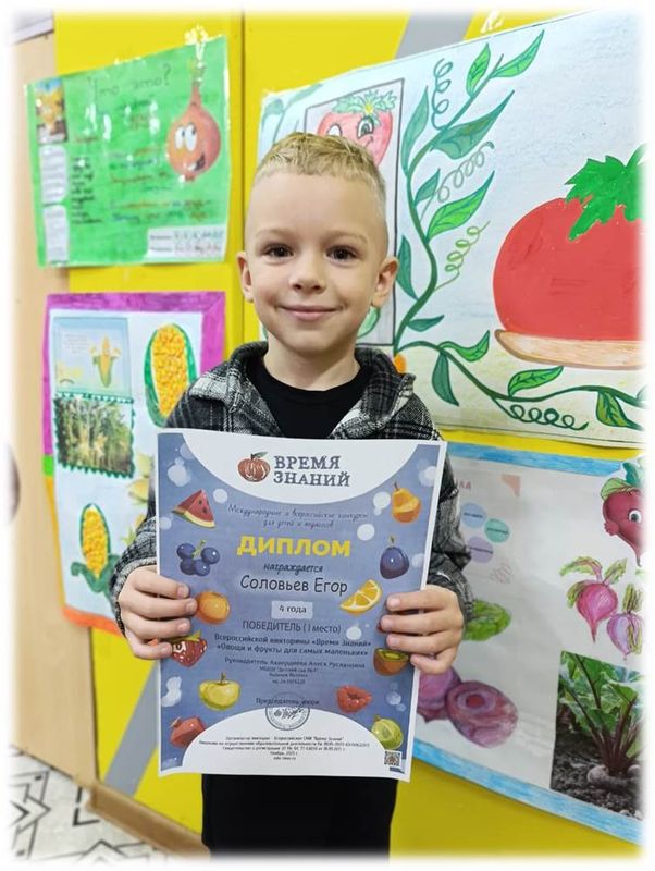 Диплом победителя (1 место) всероссийской викторины "Овощи и фрукты для самых маленьких"