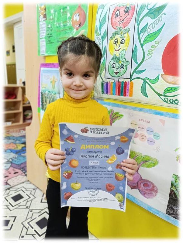 Диплом победителя (3 место) всероссийской викторины "Овощи и фрукты для самых маленьких"