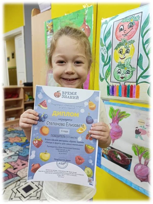 Диплом победителя (2 место) всероссийской викторины "Овощи и фрукты для самых маленьких"